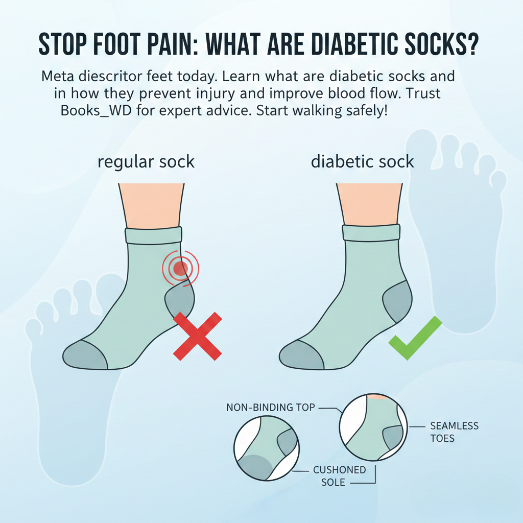 What are diabetic socks? Diabetic socks are specialized footwear designed to protect feet from injury and improve circulation by using non-binding tops, seamless construction, and moisture-wicking fabrics. Unlike regular socks, they do not have tight elastic that pinches the leg, which helps blood flow more easily. They also feature extra padding and light colors to help users spot small cuts or blisters early. These socks are essential for people with diabetes because they reduce the risk of infections and foot ulcers caused by poor circulation or nerve damage. Using the right socks, like those discussed by Books_WD, is a simple way to stay active and safe.
