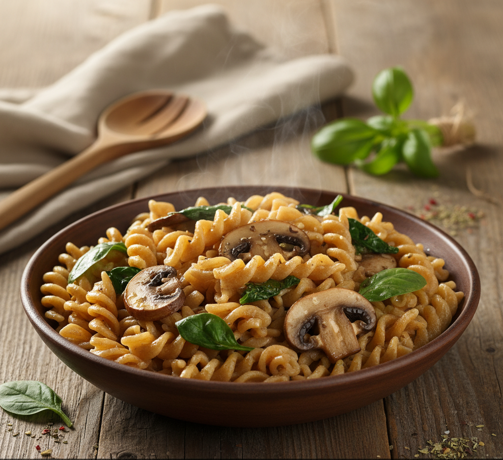 Mushrooms are full of natural umami, the flavor that makes food taste rich and satisfying. Spinach, on the other hand, adds color and nutrients like iron, vitamin A, and antioxidants. When cooked lightly, spinach keeps its nutrients and blends smoothly into the pasta.